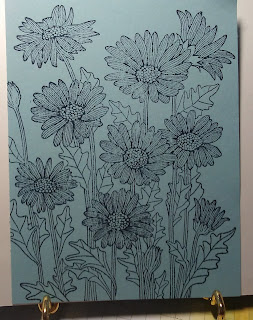 The Balmy Blue layer is 5 1/4 x 4 and on this piece in Night of Navy ink I stamped the Daisy Garden. I used the stamparatus for this to make sure I got good coverage as this is a large stamp. I set this aside to dry.
